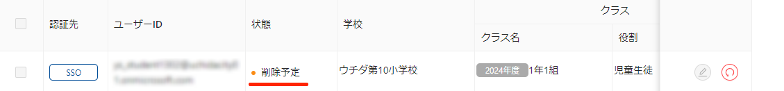「削除予定」は、サーバへ削除同期を実施する前の状態です。削除同期の実施後に、SSOユーザーは削除されます。