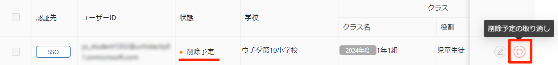 誤ってSSOユーザーを削除しても、ユーザーの状態が「削除予定」であれば、取り消しボタンで状態を元に戻せます。
