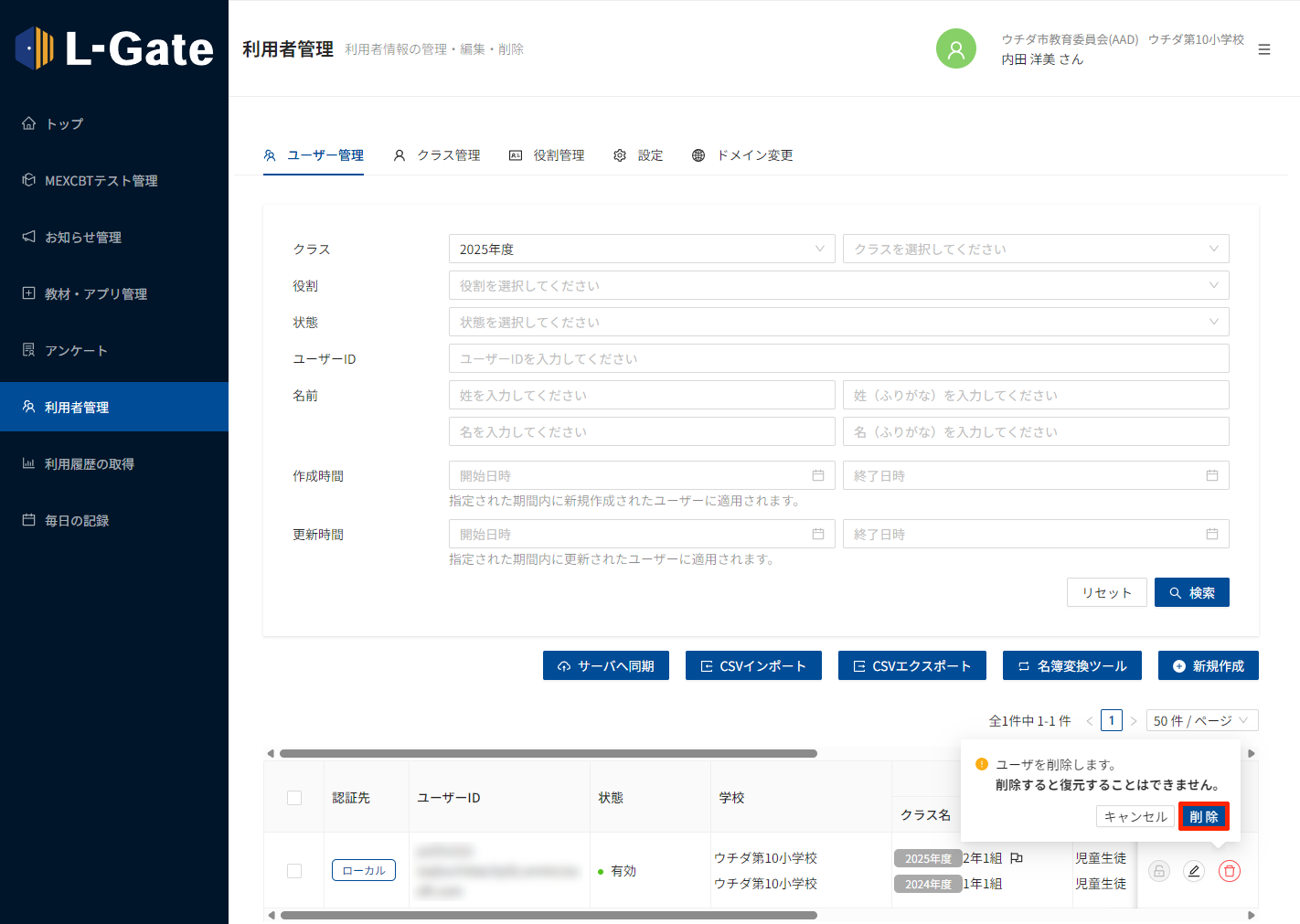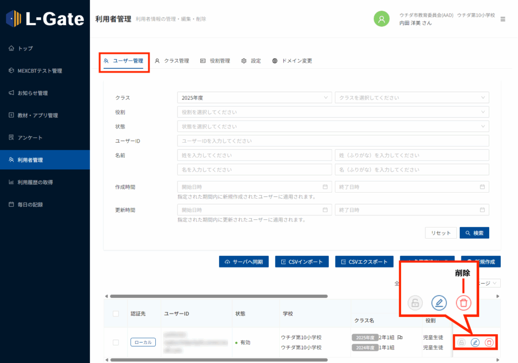 2. 「ユーザー管理」タブをクリックし、削除する教員・生徒の行の「削除」をクリックします。