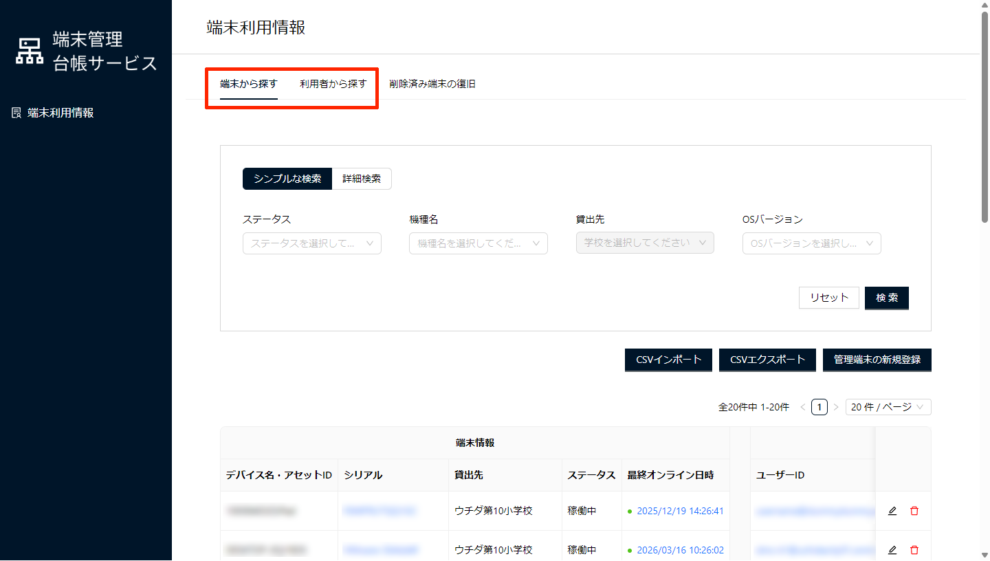 新しいタブで、「端末管理台帳サービス」画面が表示されます。
