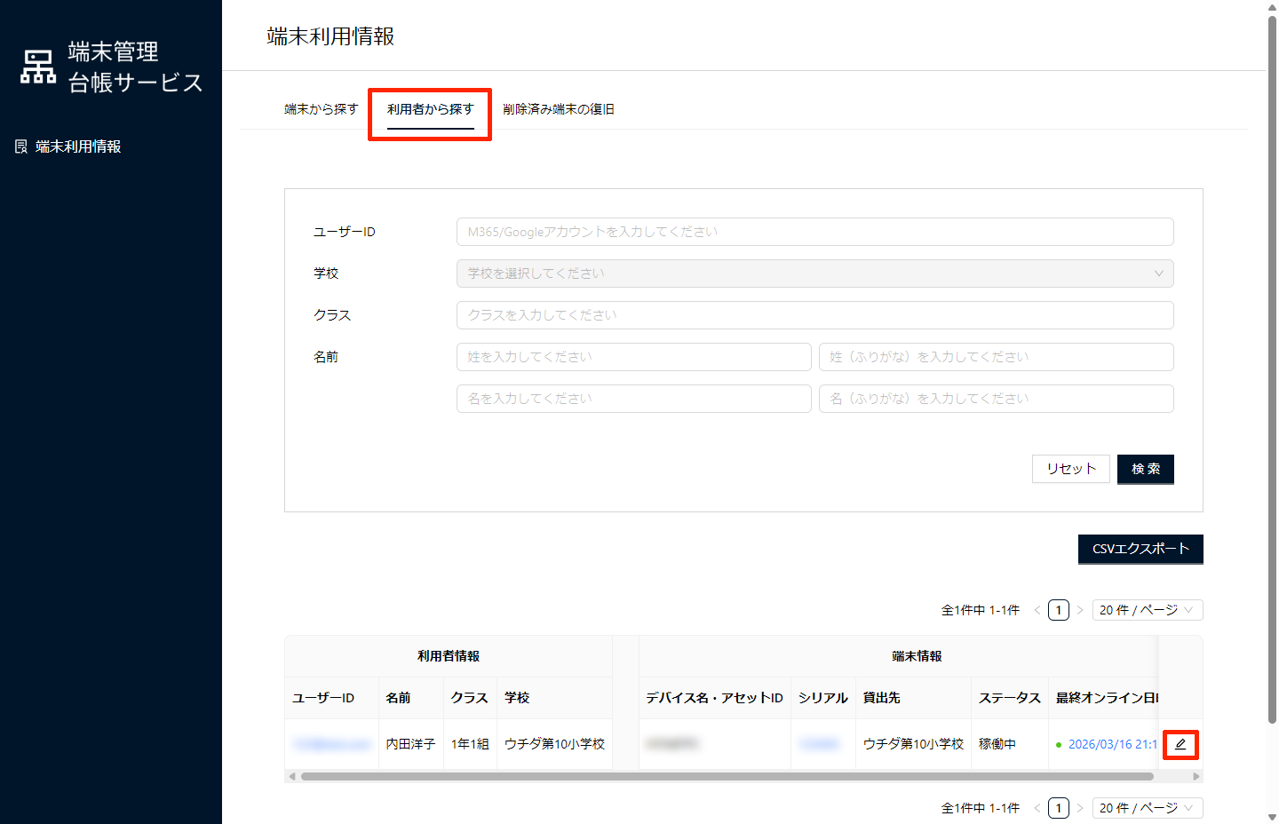 1. 全体管理者管理画面または学校ごとの管理画面で、「端末管理台帳」をクリックします。