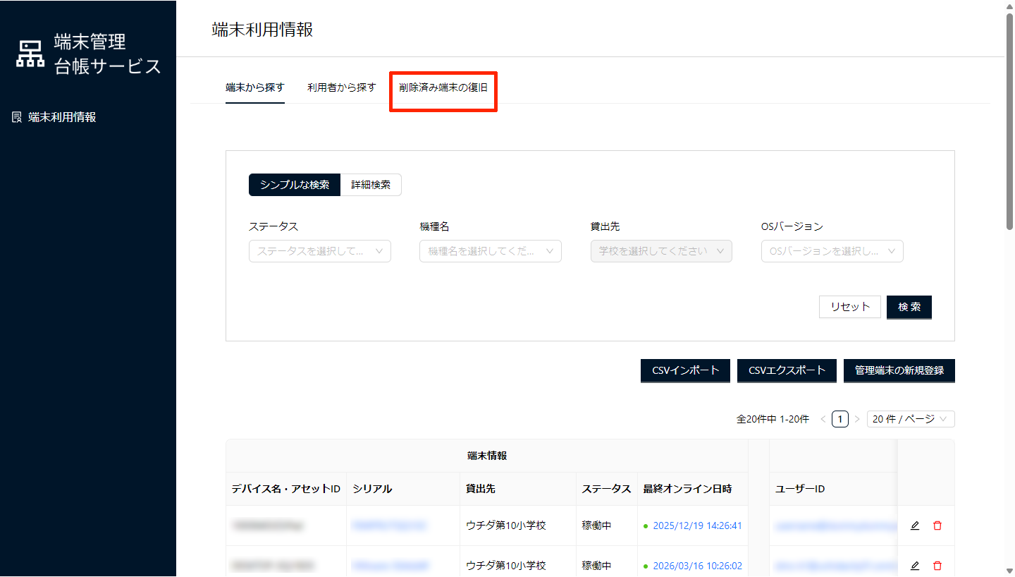 端末を削除する」で、端末管理台帳サービス上から削除した端末を復旧できます。