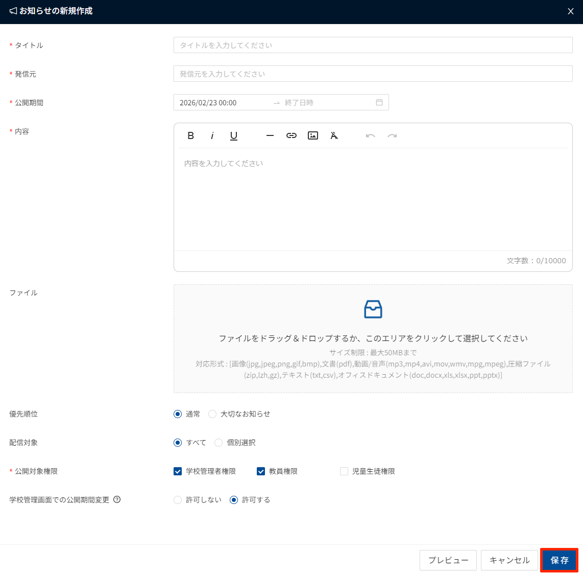 | 公開対象権限 | 必須 | 公開対象の権限を指定します。初期状態では「学校管理者権限」と「教員権限」が指定されます。 権限別に指定することもできます。 |