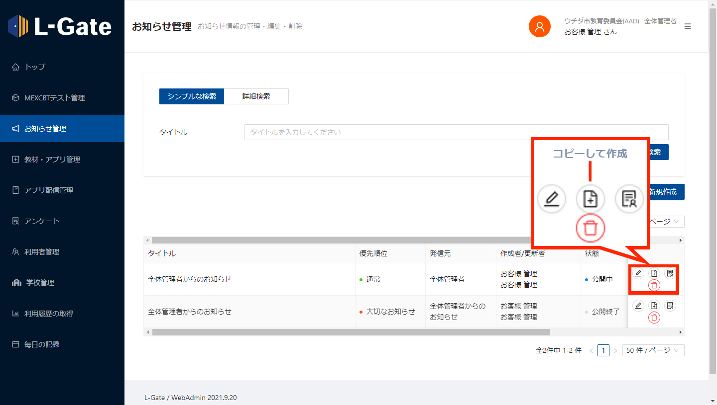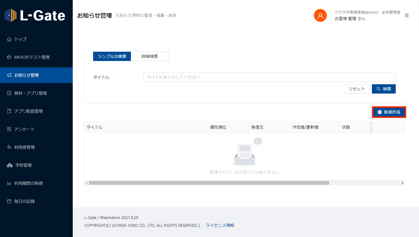 お知らせを全体管理者から利用団体内の学校に一括で配信することができます。