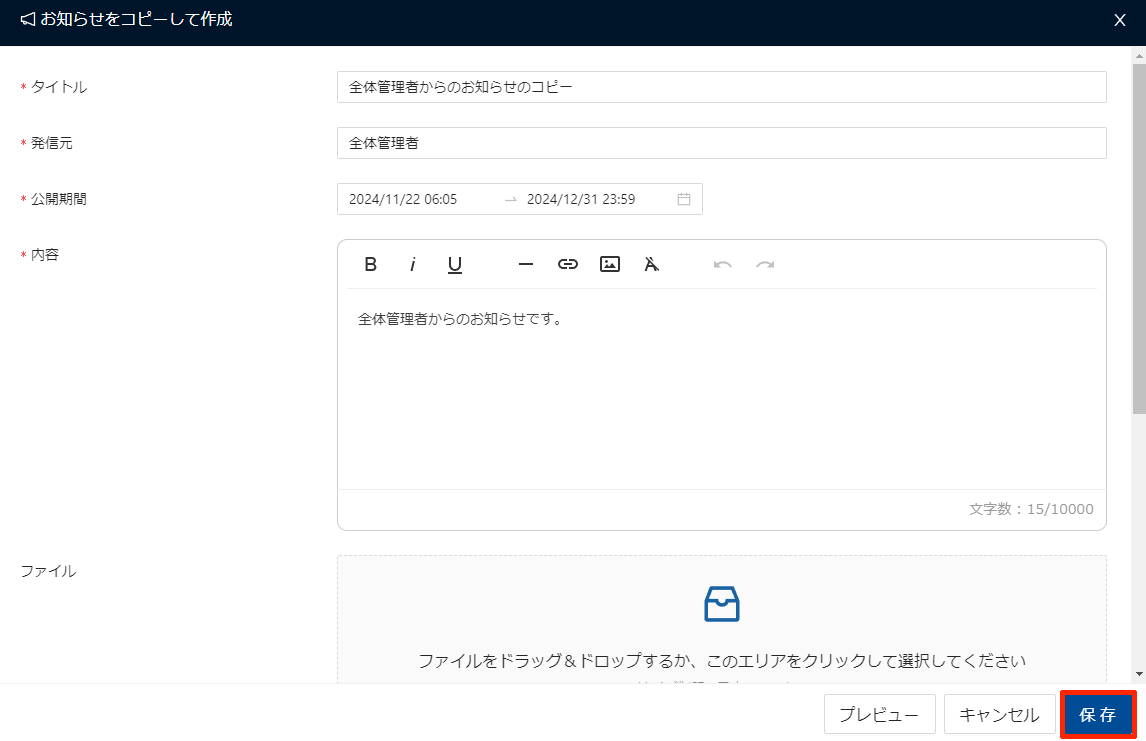 2. 流用したお知らせの内容がコピーされていますので、変更する項目を入力または選択し、「保存」をクリックします。*