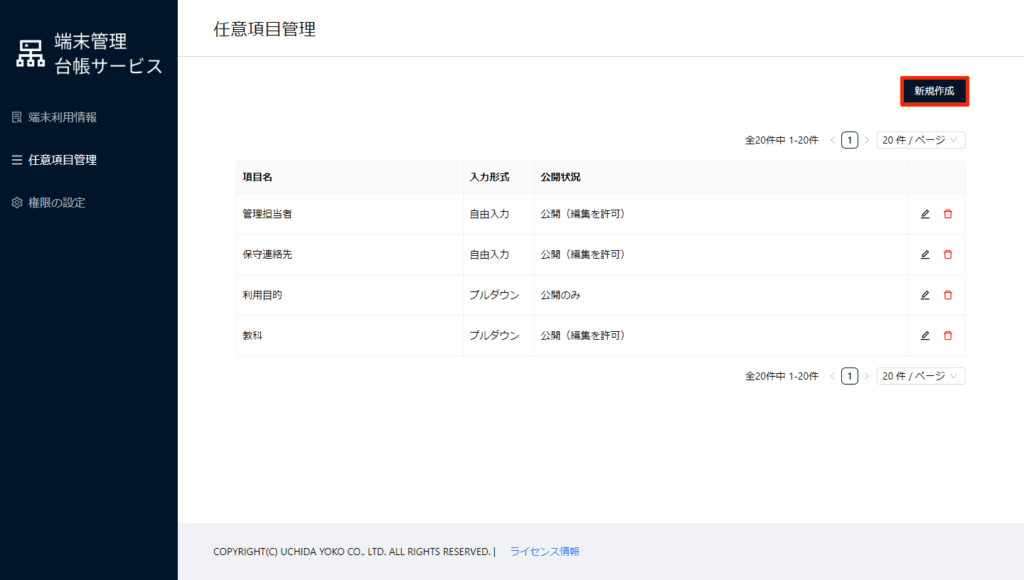「任意項目管理」画面で、「新規作成」をクリックします。