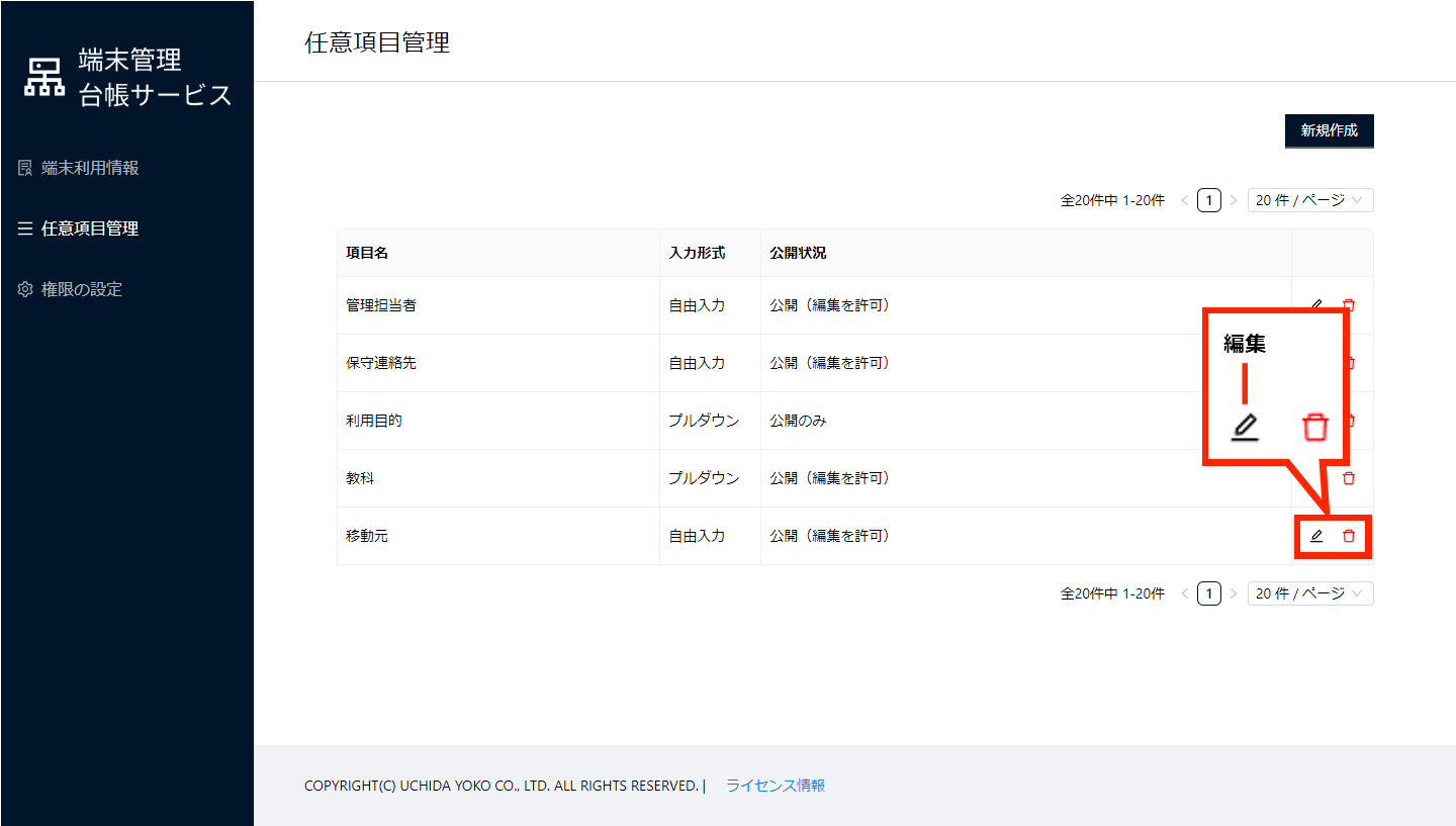 「任意項目管理」画面で、編集する任意項目の行の「編集」をクリックします。
