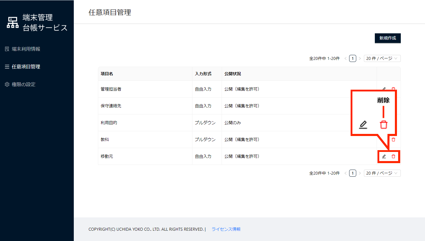 「任意項目管理」画面で、削除する任意項目の行の「削除」をクリックします。