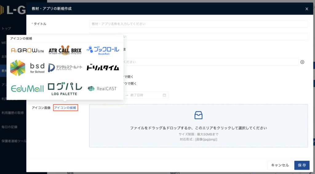 教材・アプリのアイコン画像を登録する項目で、「アイコンの候補」をクリックまたはタップすると、アイコンの一覧が表示されます。