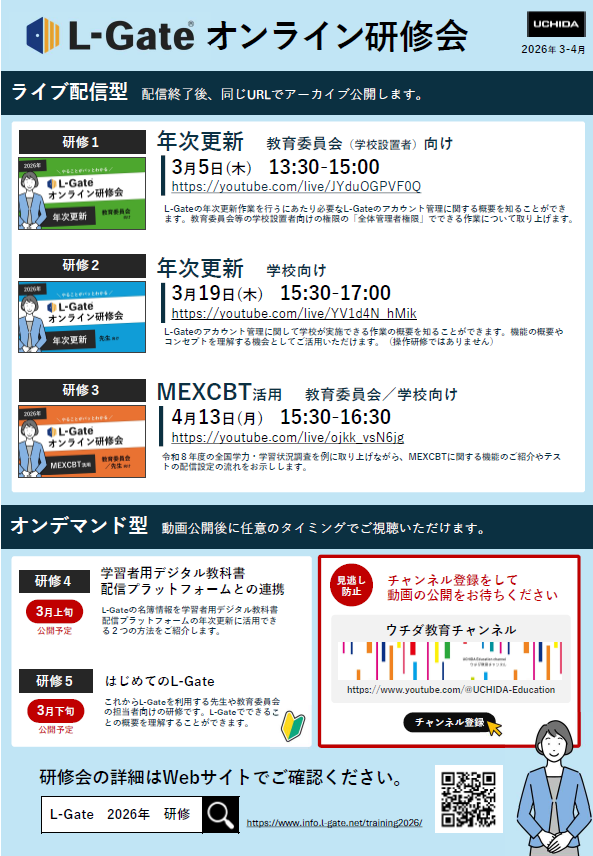 年次更新や全国学力・学習状況調査で利用する機能に特化したカリキュラムや、これから初めてL-Gateを利用される先生や教育委員会向けの研修メニューをご用意しております。メニューによってその場でご質問をお受けするライブ配信形式とYouTubeで研修動画を公開するオンデマンド形式の2パターンでご用意いたします。後日アーカイブ動画を公開いたしますので、あわせてご活用ください。