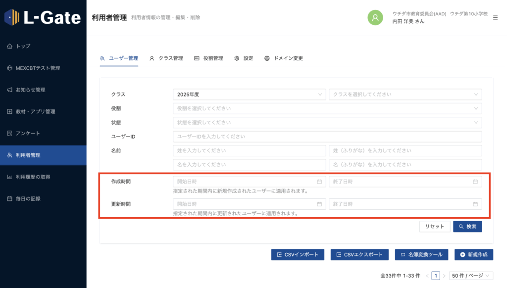 特定の作成日・更新日を指定して、該当するユーザーを抽出できます。年次更新やユーザーメンテナンスの際に、更新対象者を絞り込む用途でご利用いただけます。