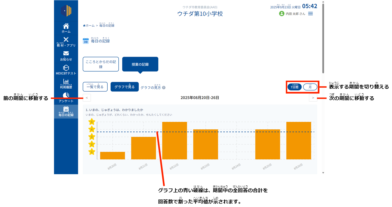 くわしくは、「毎日の記録の結果を一覧する(教員・学校管理者用)」をごらんください。